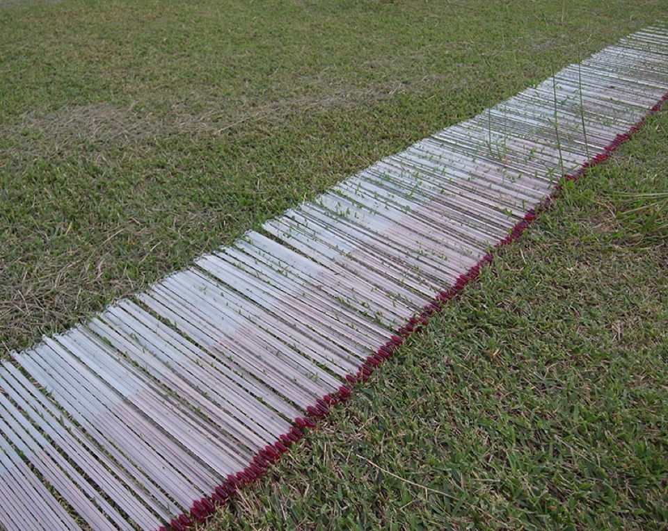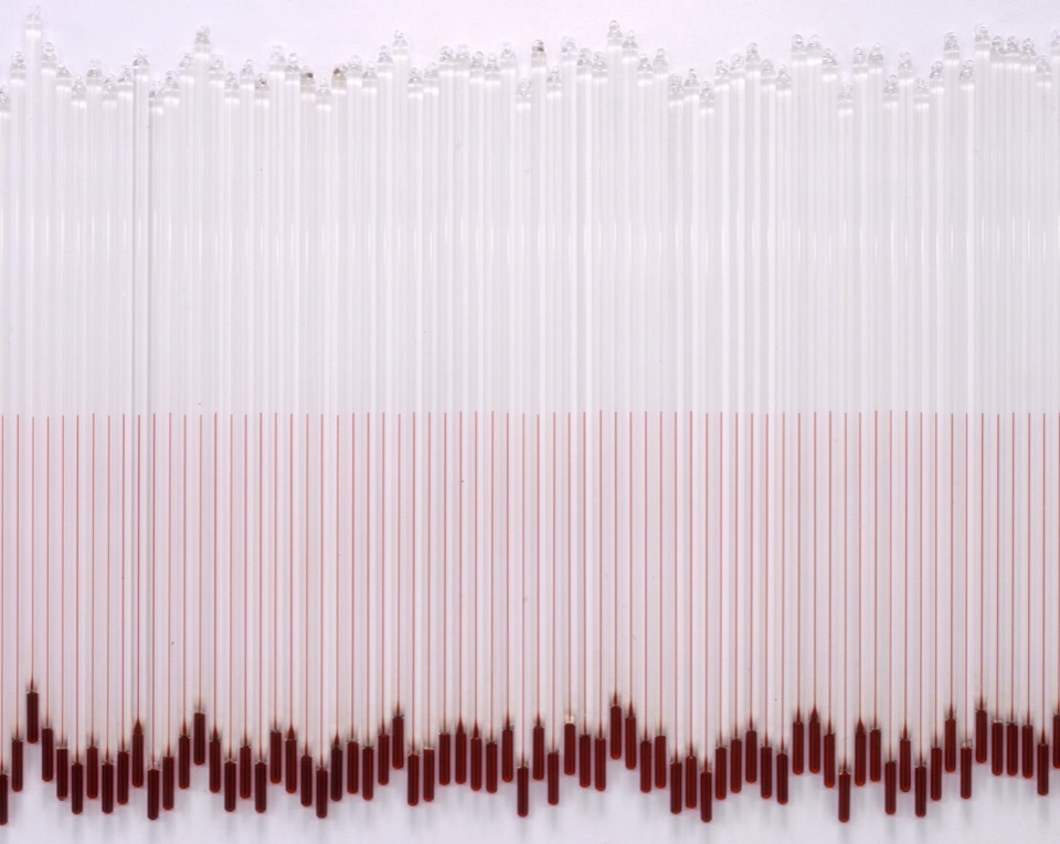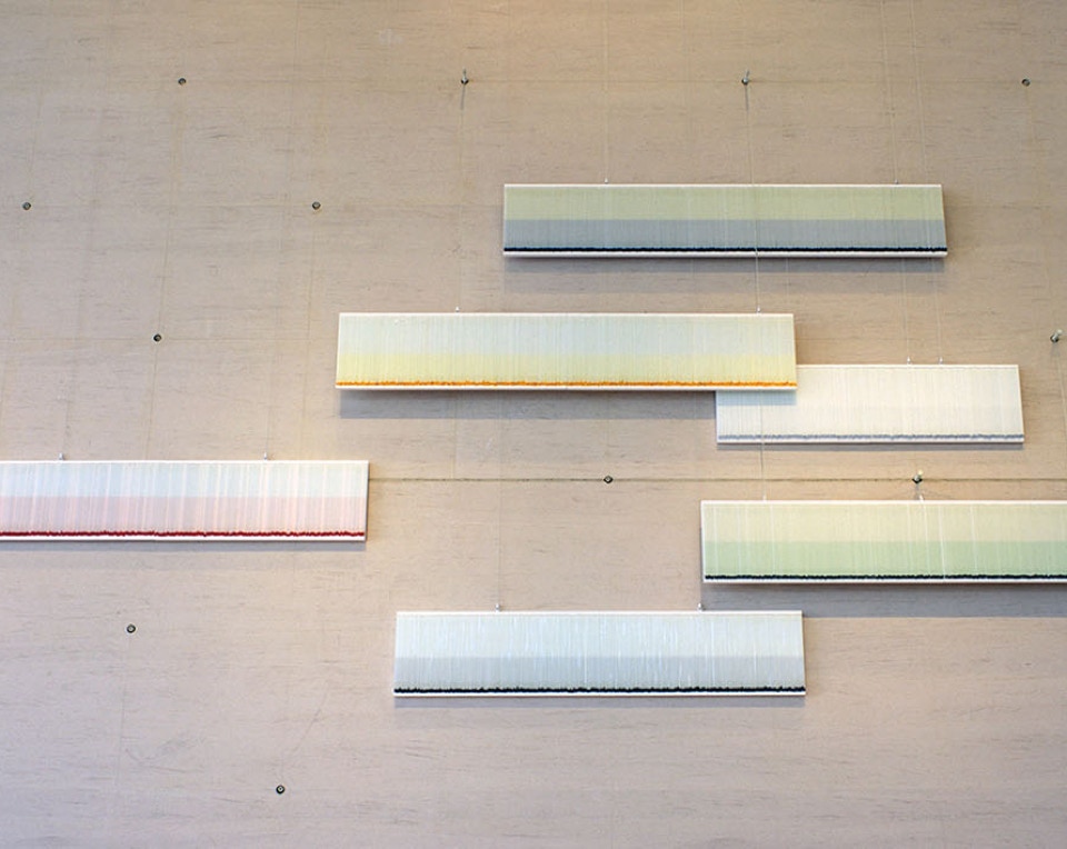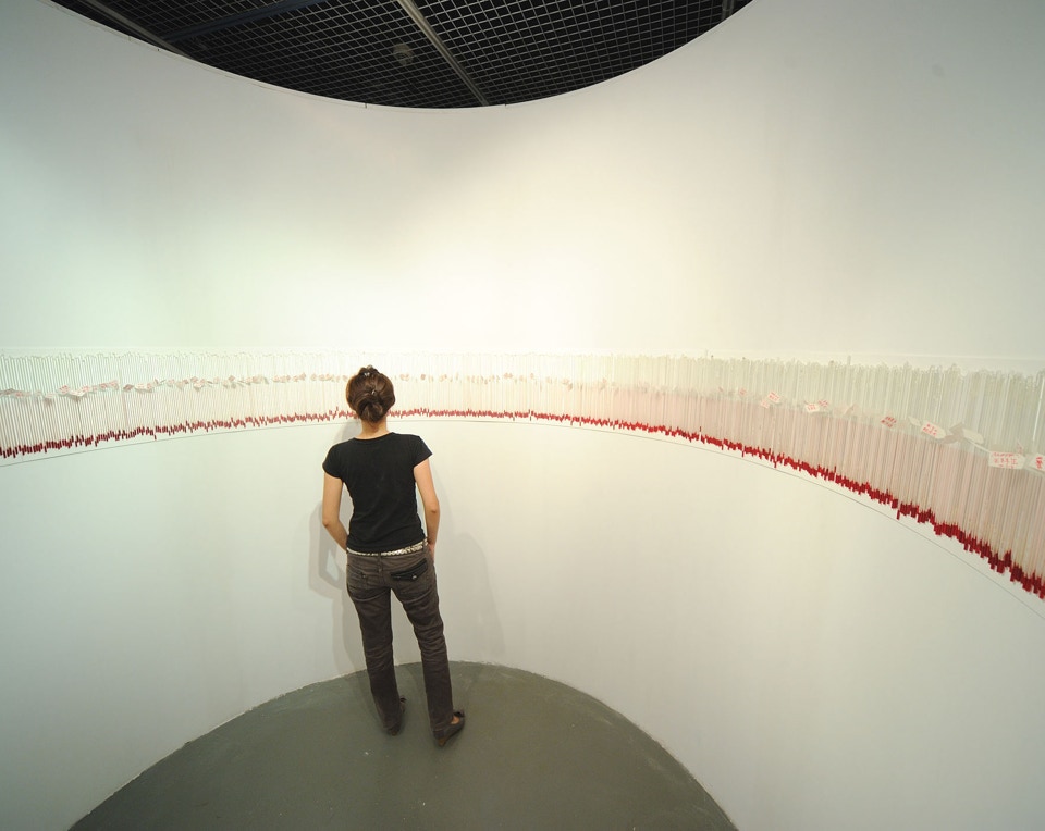 私が一環して作品の素材としている物は、誰もが一度は触れた事のある温度計です。ただ、その温度計は目盛りが取り除かれているので、温度を数値で読み取る事は出来ません。その温度計を数十、数百、数千と並べて行くと、温度が作る赤い水平線が見えてきます。その水平線は、人が触れればその体温で山の様な盛り上がりを作り、手を離せば元に戻ります。また、木漏れ日などが当たれば、それと共に動きます。温度は見えないが何処にでも存在し、そこに温度計が集まり並べられる事で、その一部分がその環境温度の風景として現れます。私はこれまで様々な温度計の作品を制作してきました。それらの作品は、今も絶えず様々な場所で温度の変化と共に動いています。私の仕事は温度計を介して、温度が織りなす世界を様々な形で視覚化する事と考えています。
