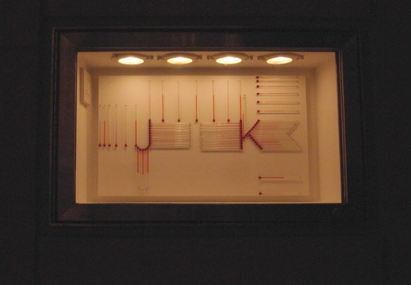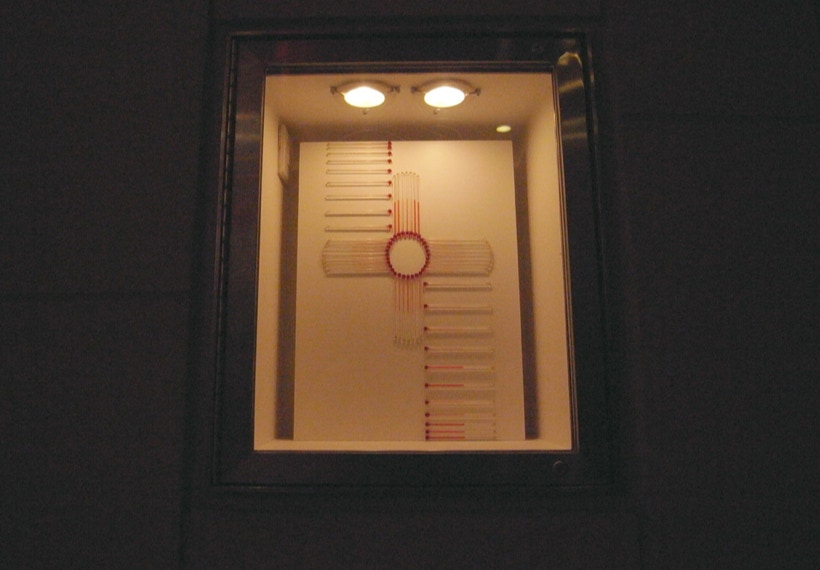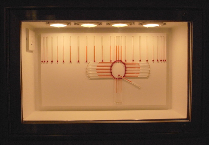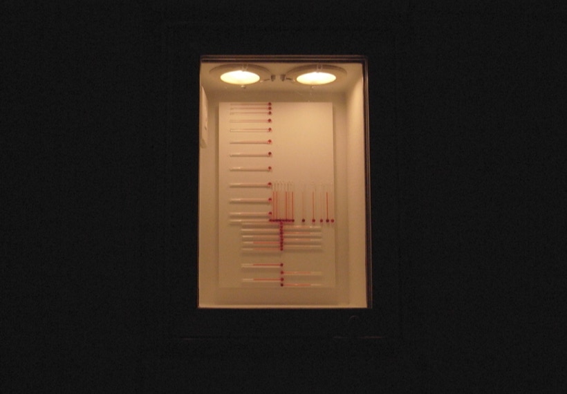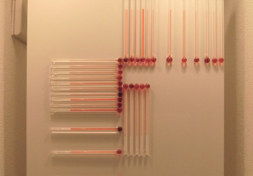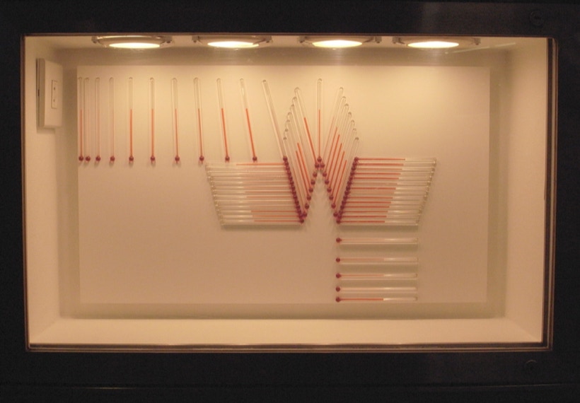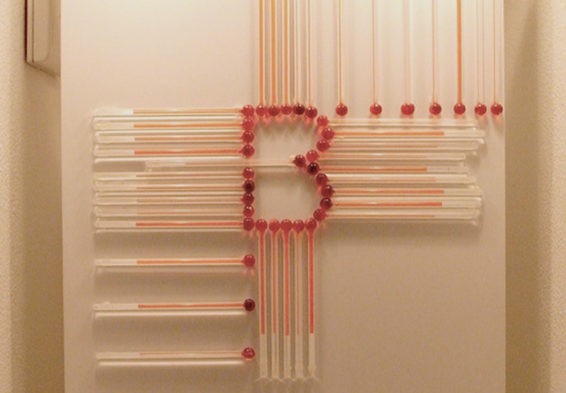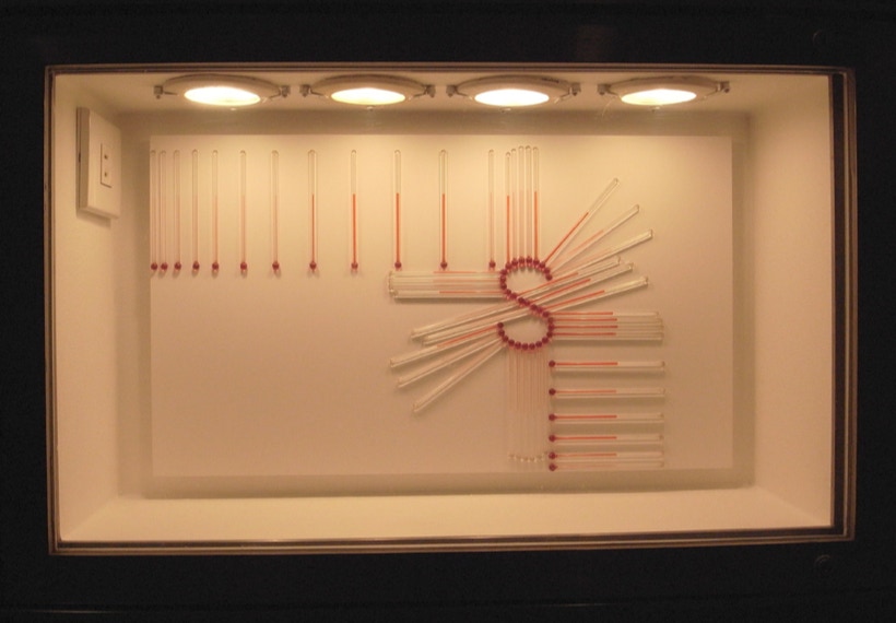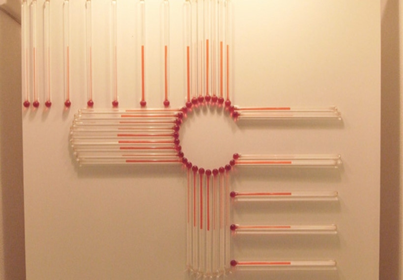 諸泉茂は温度計を素材に作品を制作しています。目盛など基準をはかるものをすべて取り除いてあるため、観る人はガラス管に閉じ込められた液体が、温度の変化に反応して示す様相とダイレクトに向き合うことになるでしょう。