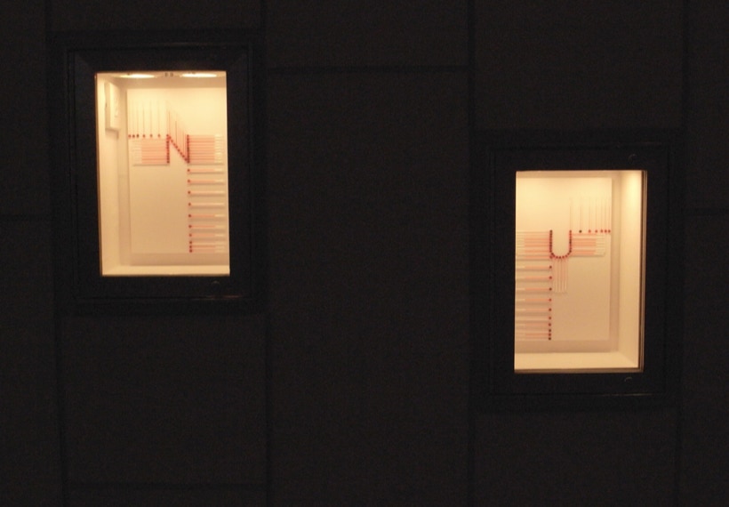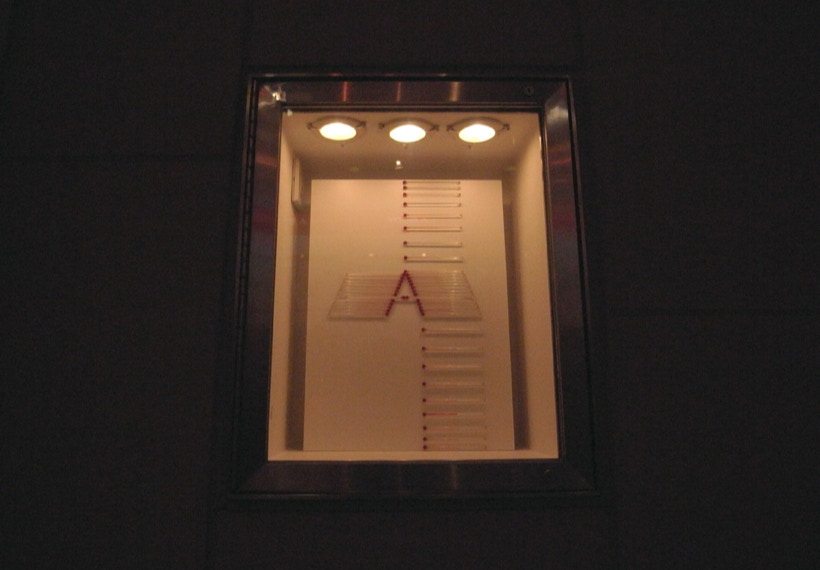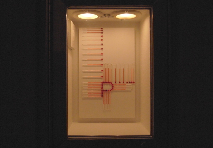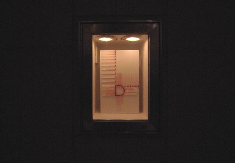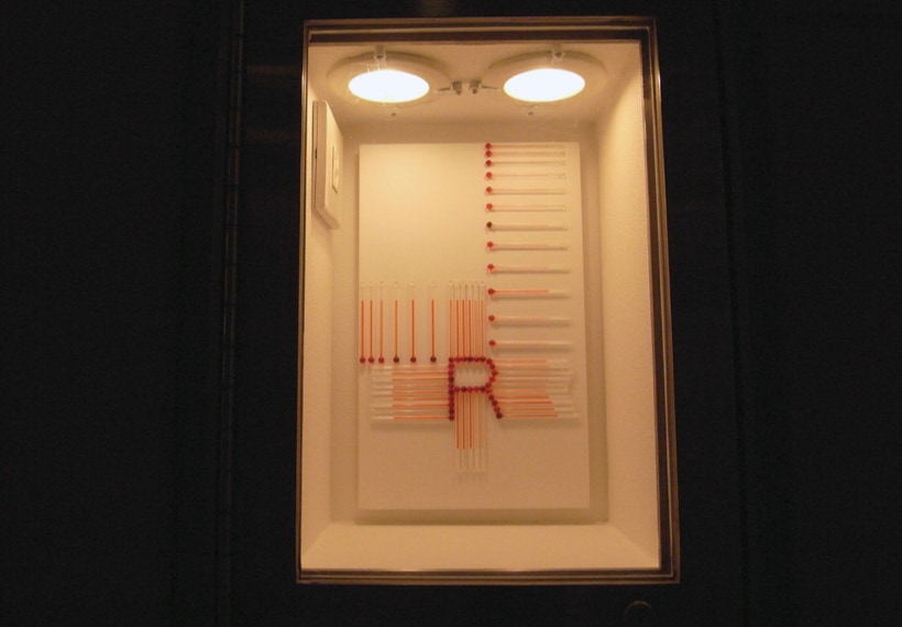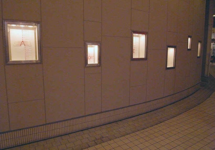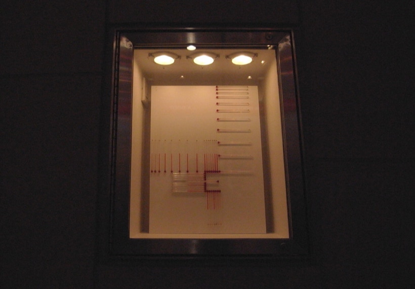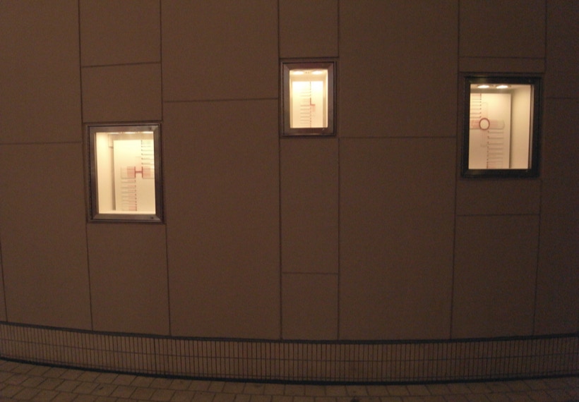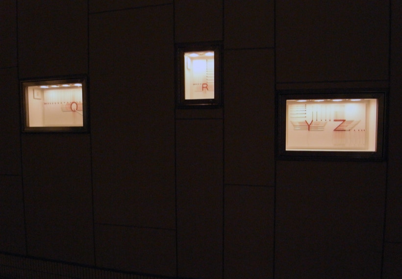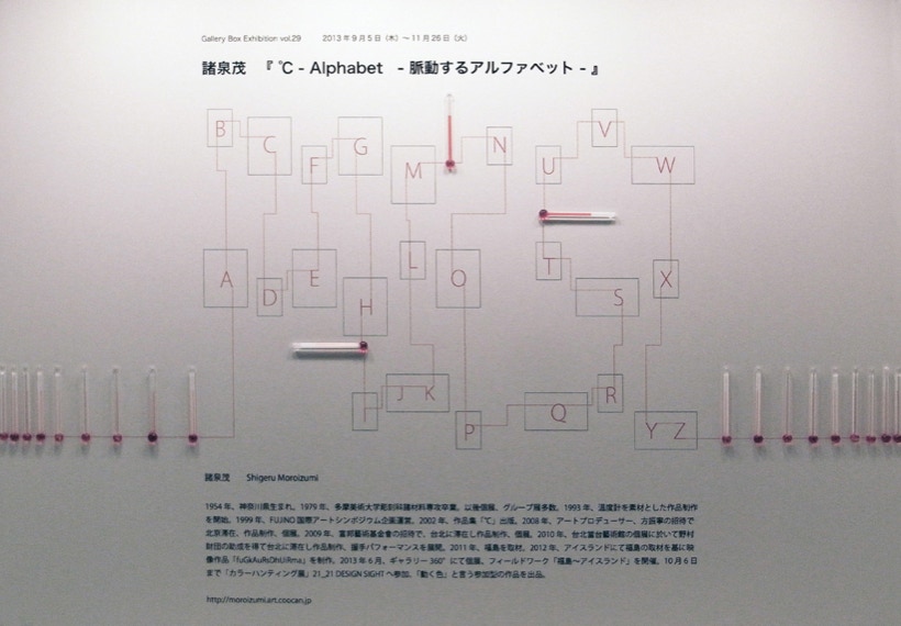 私は、温度計を並べる事で見えてくる赤い帯を温度のドローイングと呼んでいる。今回は、27個ある Box の内24個の Box の中を温度計がアルファベットを描いて通過する。温度のドローイングは、地球の自転と公転に操られ絶えず脈動しているので、今回は、この場でアルファベットが脈動し始める。
