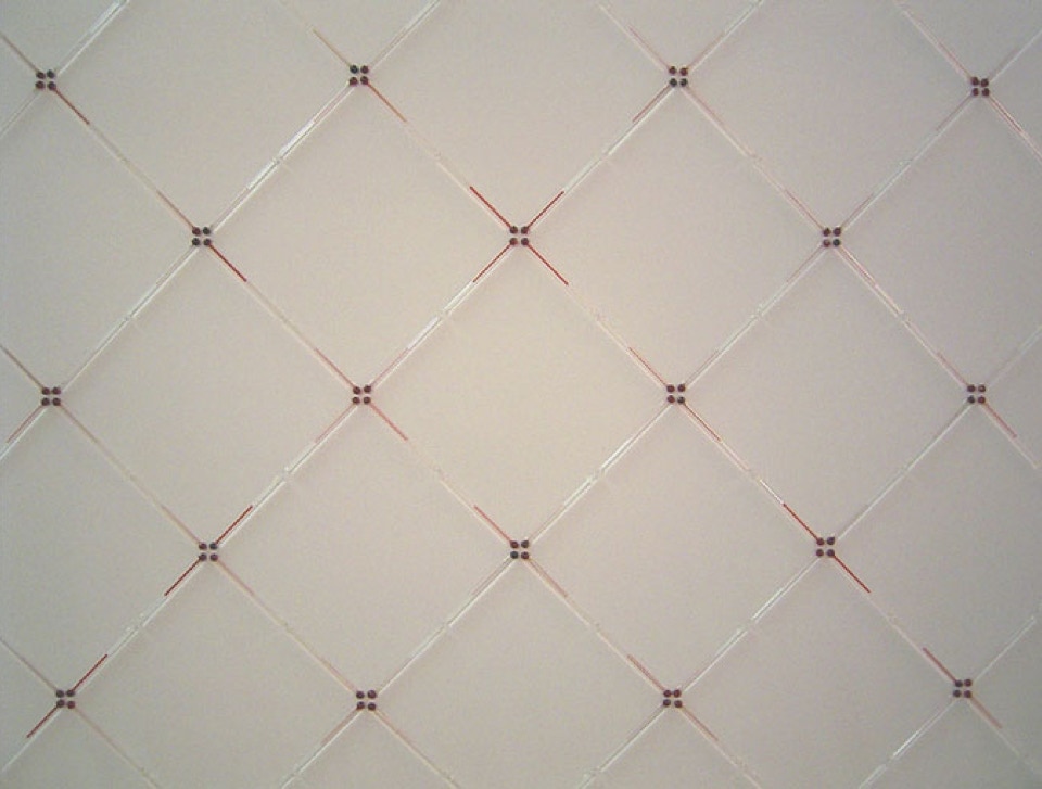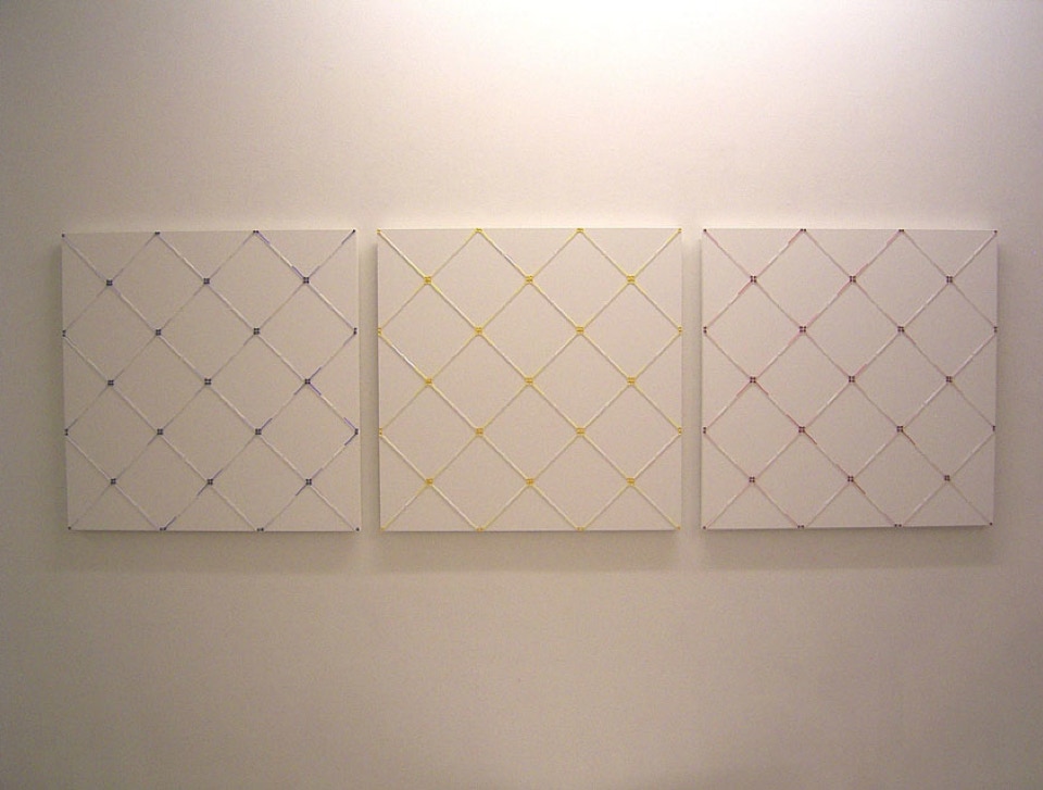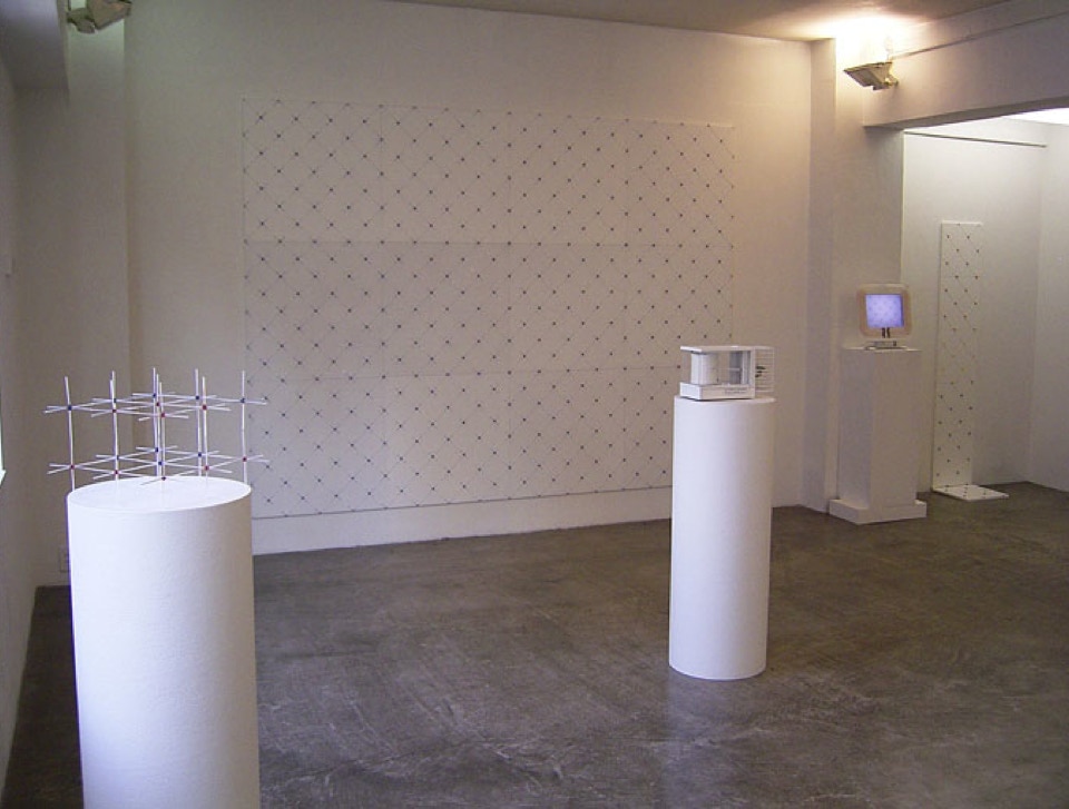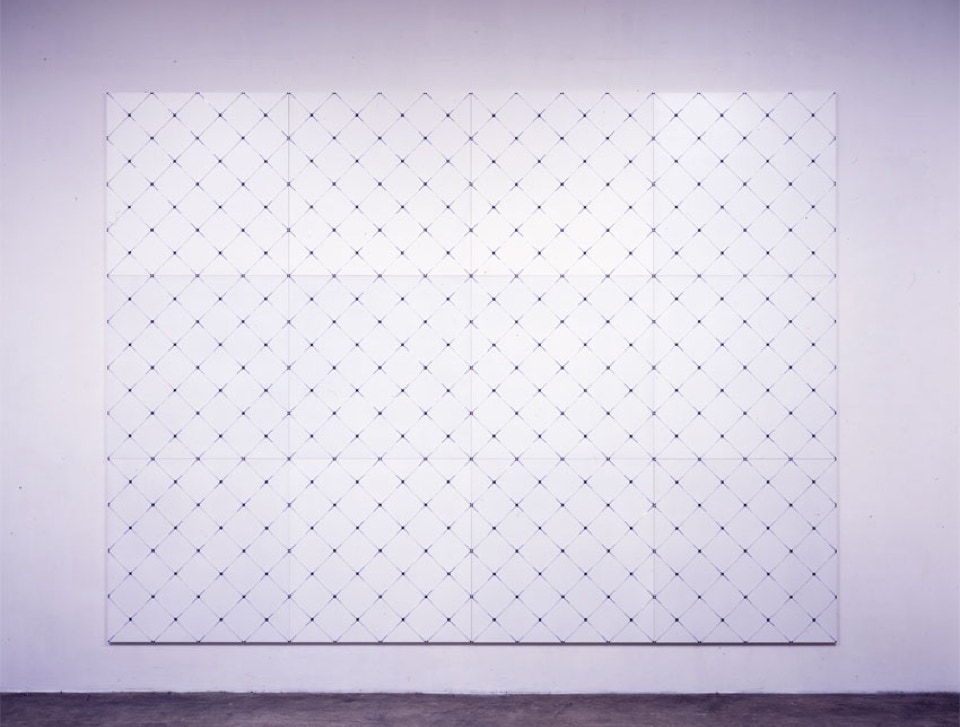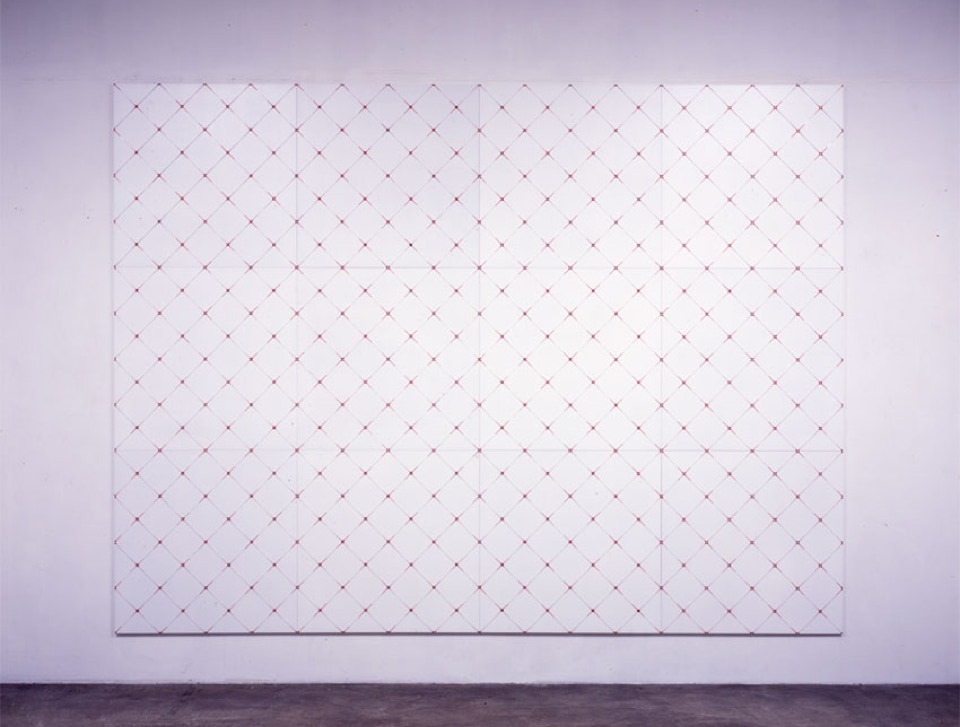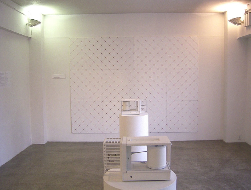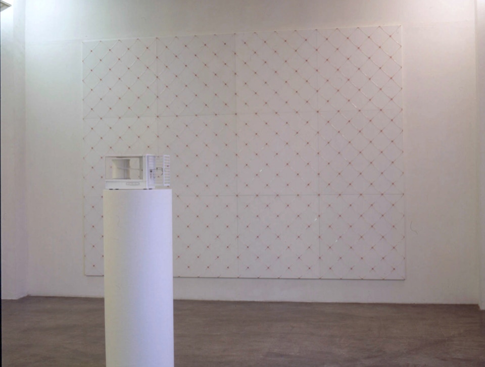 今回の作品は、4本の温度計が一点を中心に90°の角度で斜めに接する形を一つの基本の図柄(Pattern)とし壁面を網目の図柄のように構成している。これにより温度計の温度の変化による上下運動は、基本の図柄の中で、四方向へ拡大縮小するような動きに見えてくる。そして 壁面を網目状に広がった無数の図柄の点は、地球の自転と公転の関係が在る限り続く、日々の気温変化による拡大縮小運動を繰り返す事になり、私の頭の中で脈動する図柄/点の拡がりとして見えている。